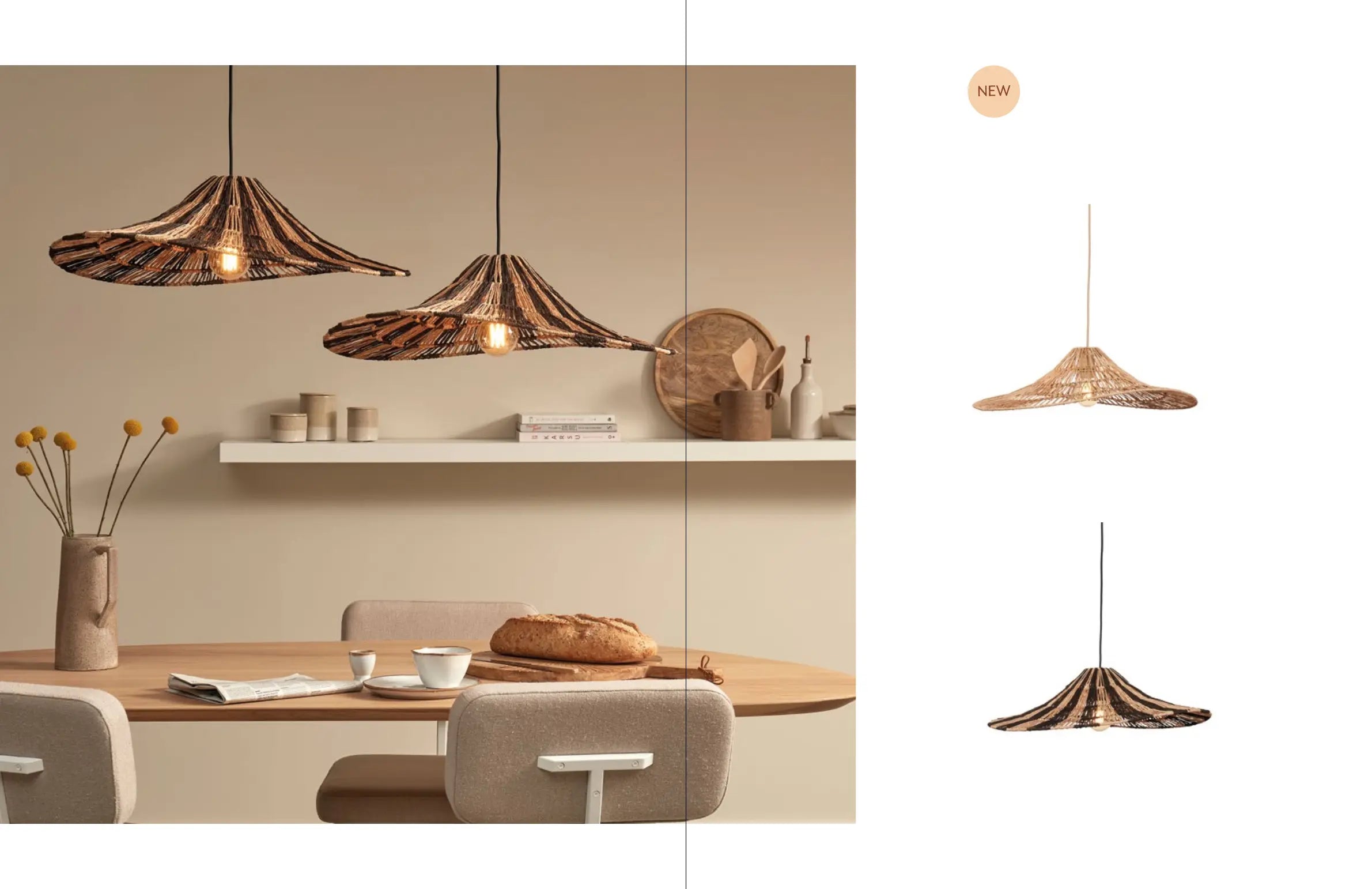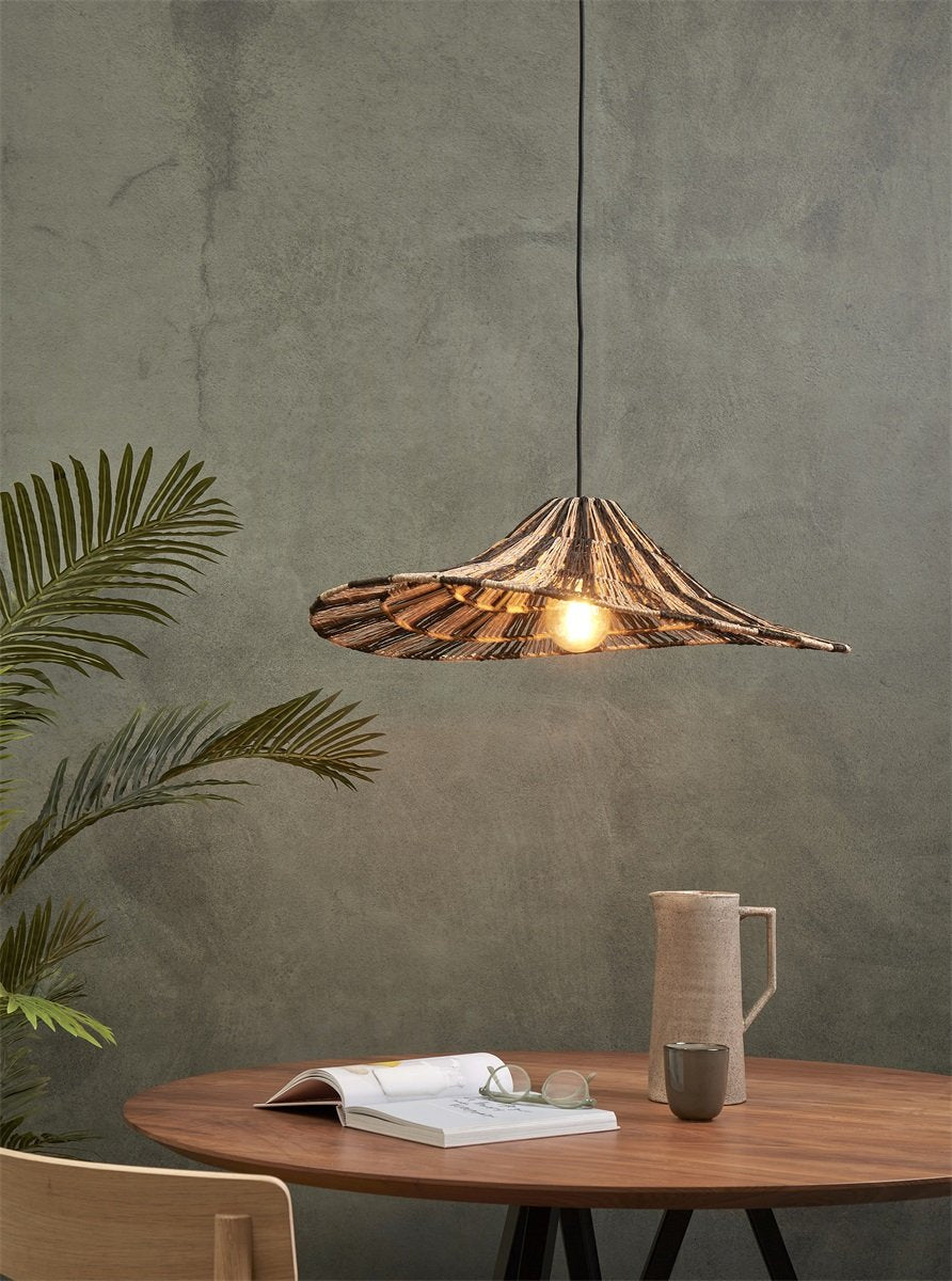 Der schwarze Akzent sowie die textile, schwarze Zuleitung setzen einen dezenten Kontrast zur natürlichen Jute und machen die Leuchte vielseitig kombinierbar: von Boho über Scandi bis hin zu modernem Naturdesign.